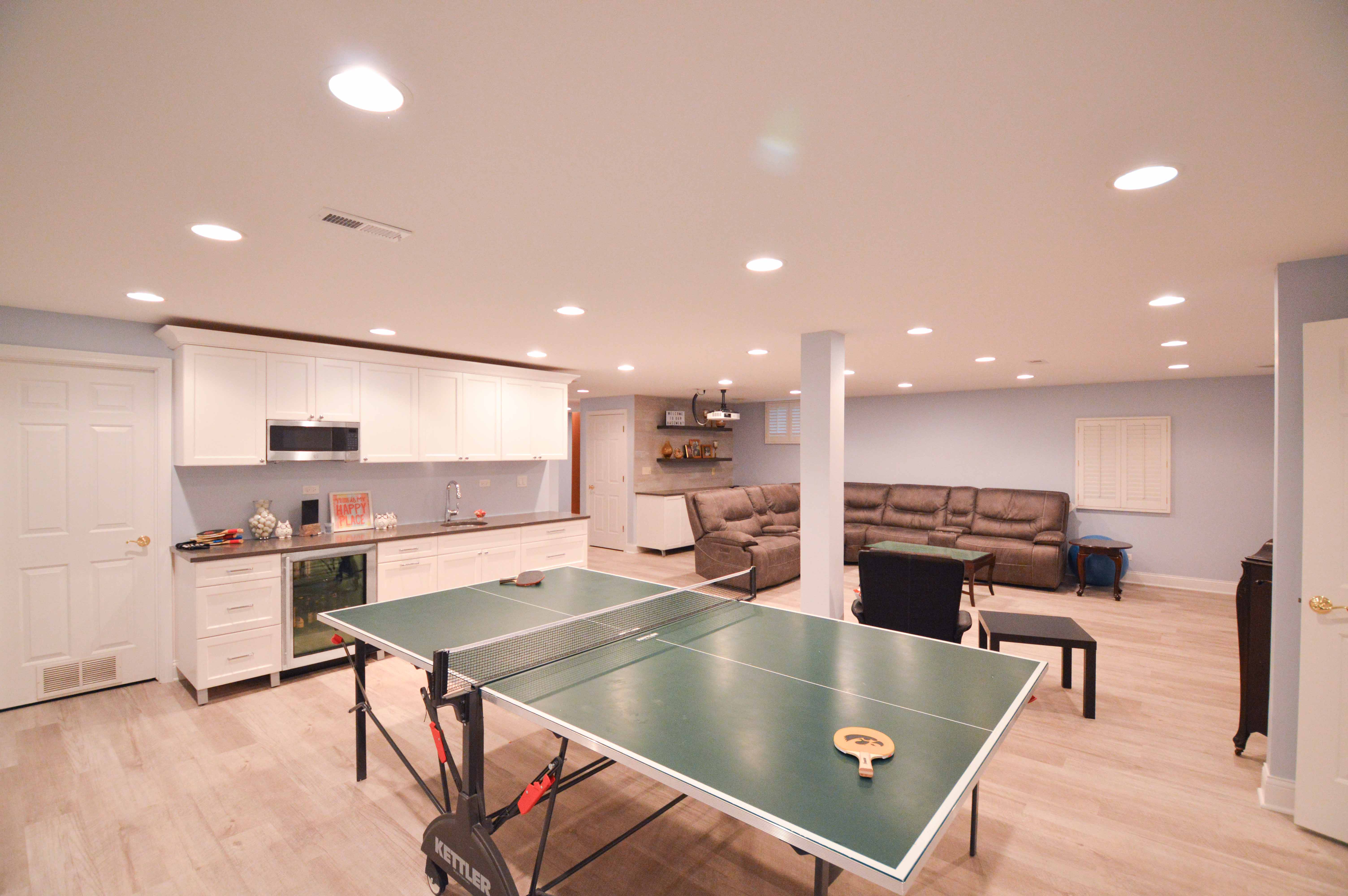 Due to the water damaged, a large portion of the basement had already been taken apart and dried up, allowing our team to finalize the cleaning and get started on the craftsmanship portion a lot sooner. Essentially, our team was brought in to help put the space back together, but with new and improved products. For example, to protect against future water damage, we suggested LVT flooring which is a water-resistant surface. We also installed all the cabinets on metal feet to prevent the main cabinets from getting wet if flooding were to occur again.