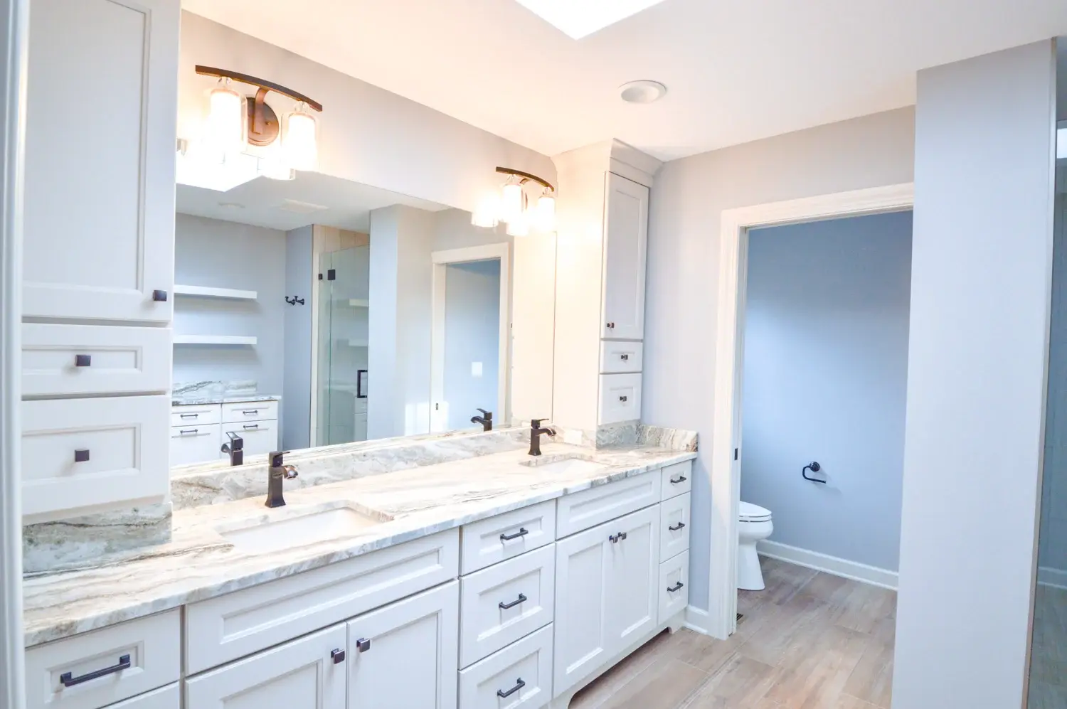 Everything that previously existed in the master bathroom was pulled out and replaced by brand new materials, personally selected by our clients. The countertops were replaced by granite countertops, an extremely water-friendly surface material. The granite also makes an appearance on the shower floor lip and as the shower bench surface, creating a cohesive feel to the whole bathroom. A custom mirror hangs above the double vanity in order to fit perfectly and snugly between the improved cabinet storage that goes from floor-to-ceiling. The hinged doors separating the bedroom, closet, and water closet are all replaced by pocket doors in order to save space. The new shower is finally the focal point with a tiled niche and corner bench seat.
