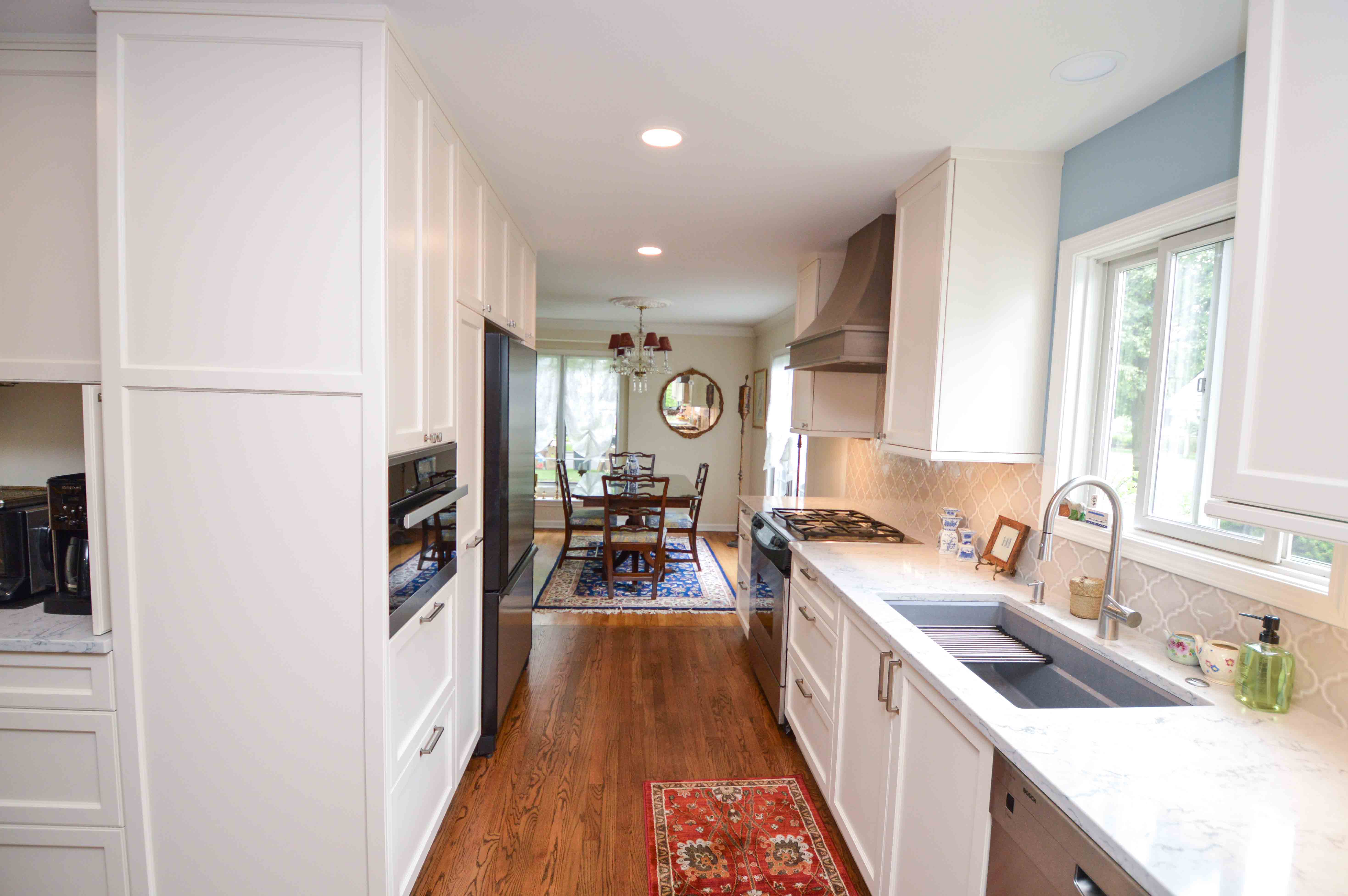 Furthermore, in order to alleviate the need for a microwave, which would take up precious cabinet space in the galley style kitchen after being removed from above the stove, our designer recommended they invest in a combi-steam oven. Our clients fell in love with the appliance and their newfound ability to cook in the dead of winter without having to open windows.