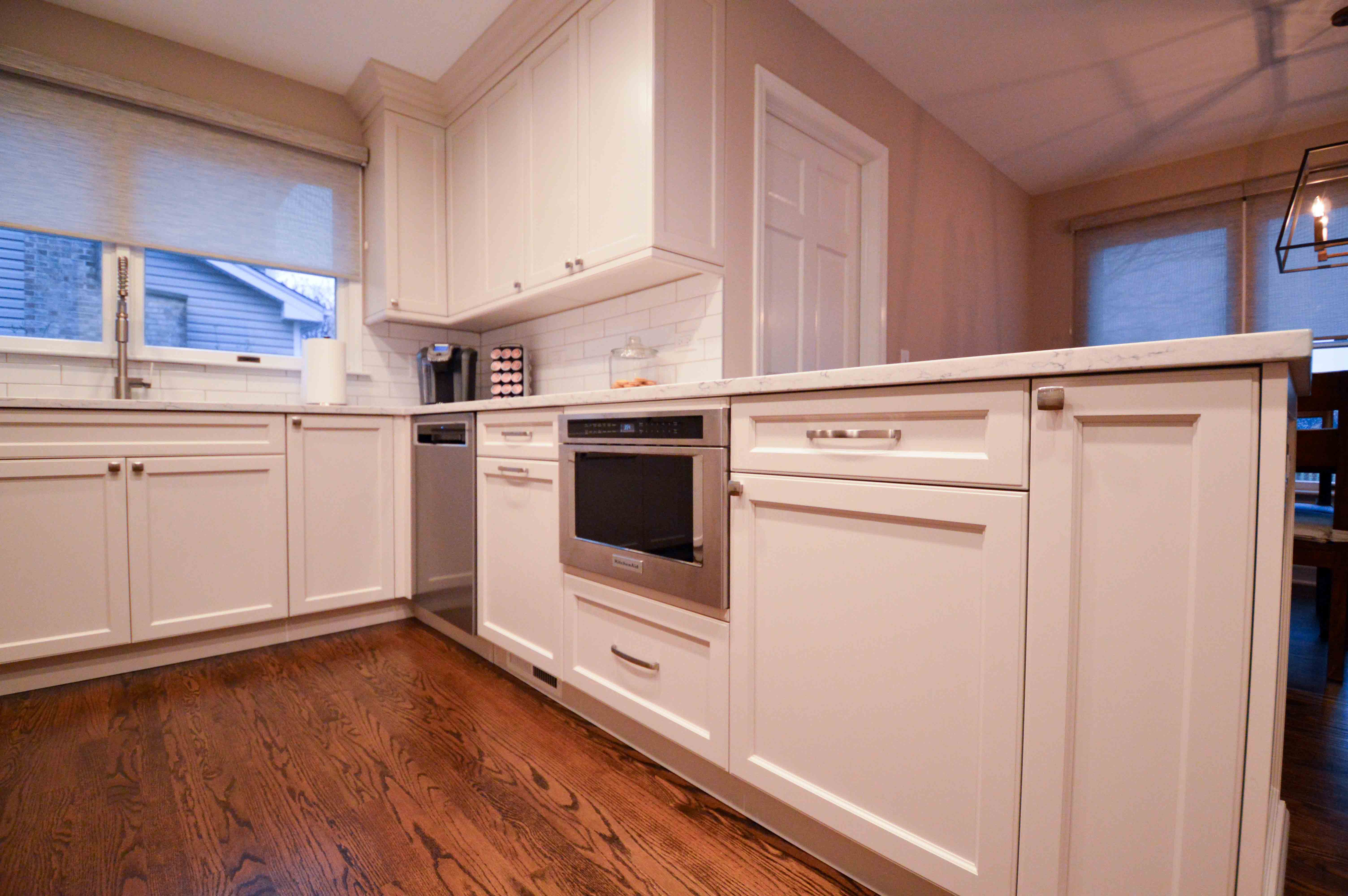 After dreaming of this kitchen for so long, these clients built up quite the wish list, including improved storage, extended countertops on the peninsula, and organization accessories. Their wish was our command, and our designer crafted a design to include each item. From the lazy Susan in the blind corner, to relocating the microwave to the lower cabinets in order to create space for a hood, every detail came together seamlessly.
