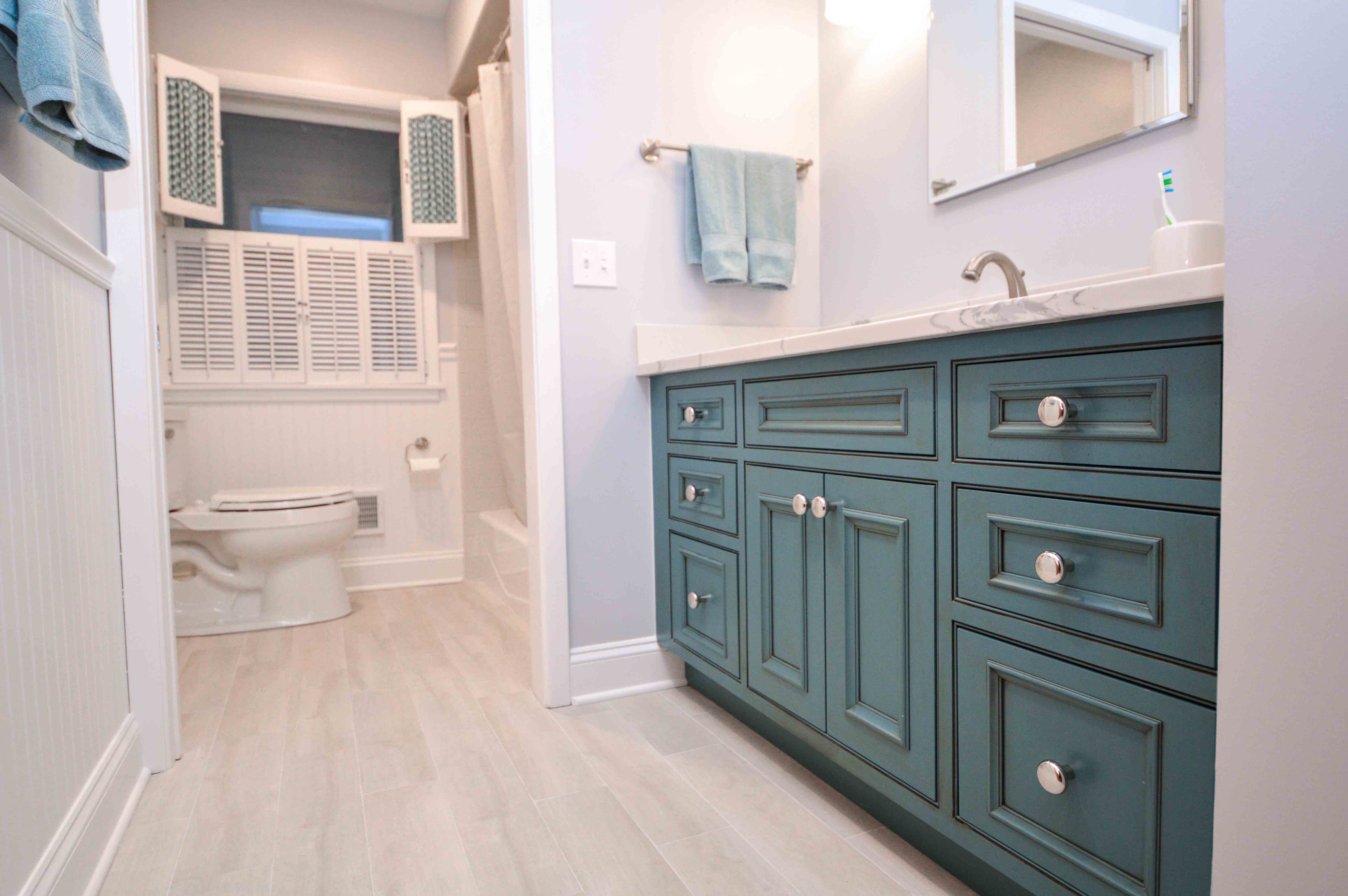 As for the look, our designer helped them recreate the design they fell in love with from a magazine in a way that maintained their budget and their functional needs. From the beadboard detail near the toilet, to the wood-like tile chosen for the flooring, everything tied together to help transport these clients to the beach cottage they always wanted.
