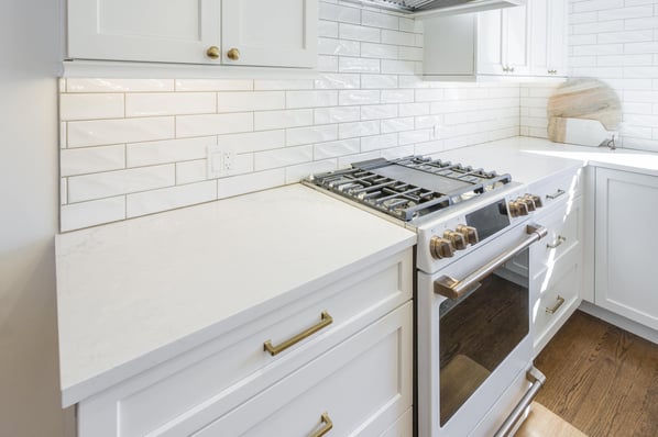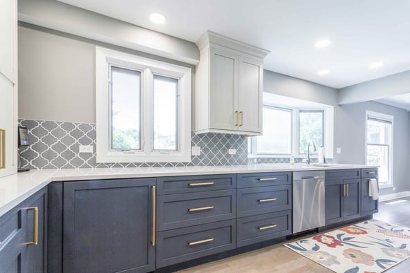 A black finish has neutral undertones that can add a dramatic contrast to your space. The matte black finish is a more recent trend in kitchen hardware and works well in industrial designs. It pairs with most neutral colors and comes in a variety of hardware styles. Matte black is a classic bathroom finish because it cleans well. Check out how we used matte black hardware in this project’s bathroom.